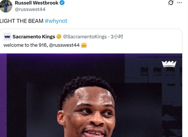 随后,威少转发了国王的社交媒体动态,配文:“LIGHT THE BEAM (国王口号,点亮光束)#为什么不呢(威少个人口号)。”